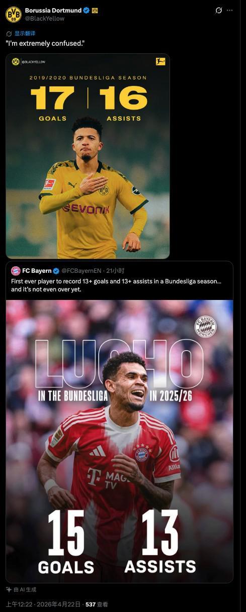 拜仁官方“吹”路易斯-迪亚斯表现,多特官方用桑乔数据指正